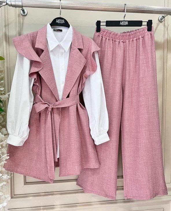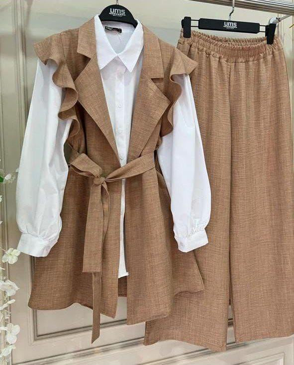 طقم ثلاثي أنيق مكوّن من قميص أبيض، فيست طويل بحزام، وبنطلون واسع. تصميم محتشم وعصري مناسب للجامعة، العمل والخرجات اليومية. قماش مريح ومتوفر بعدة ألوان جذابة.